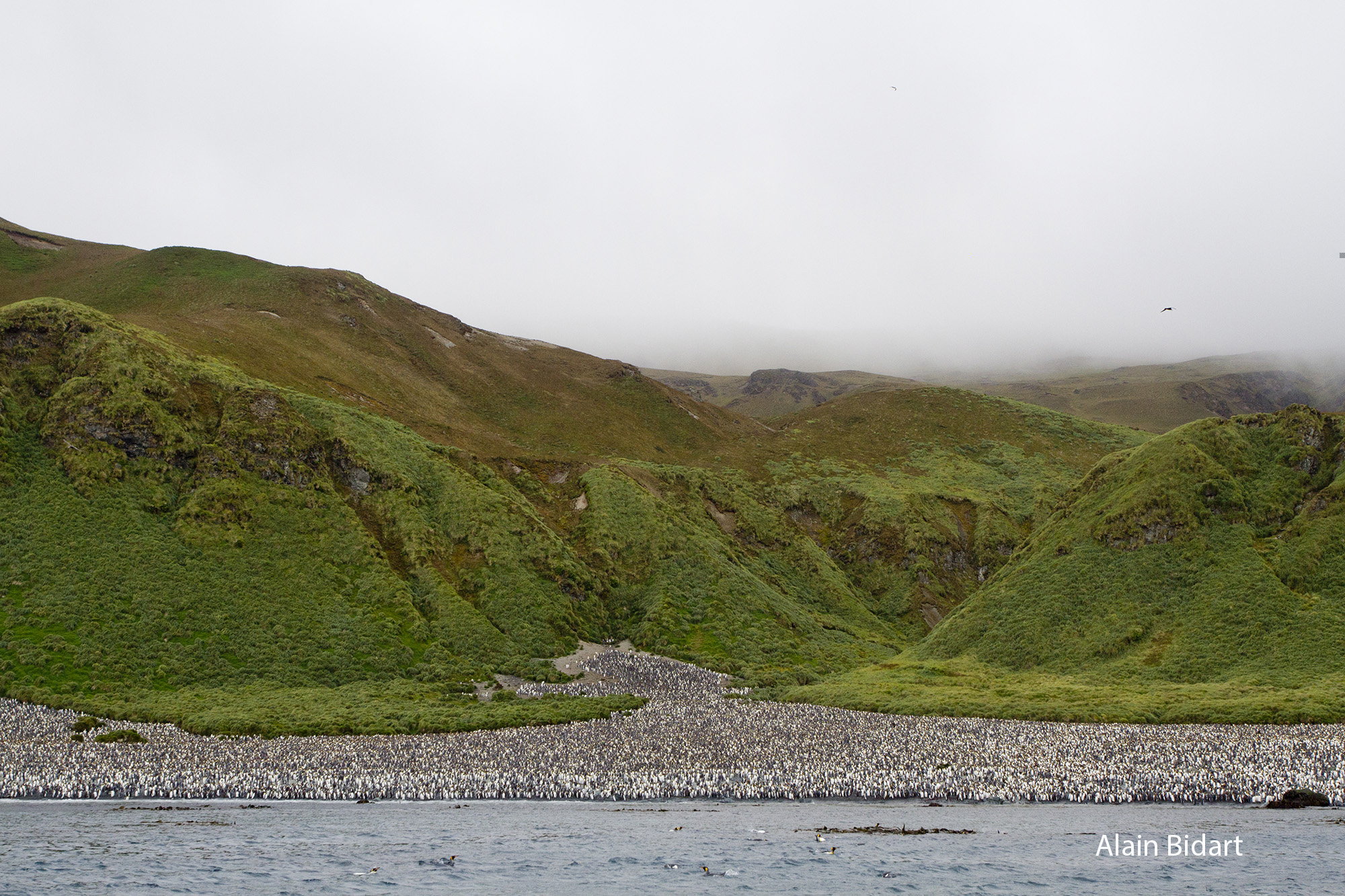 Dans la baie Lusitania, au sud-est de l’île Macquarie, vu de mon zodiac il me semble qu’une coulée massive sorte du tussock dans la pente côtière et s’étale sur la plage. Cette matière gris-bleu pointillée de blanc, ce sont au moins 170 000 couples de Manchots royaux [heupink2012, chiffre de 2000, mais en expansion depuis]. Au milieu de la colonie sont encore visibles les restes rouillés de cuiseurs où les manchots étaient fondus à partir de 1890 pour obtenir de l’huile. Les Royaux, décimés par des hommes ont finalement gagné le combat, du moins sur cette île.